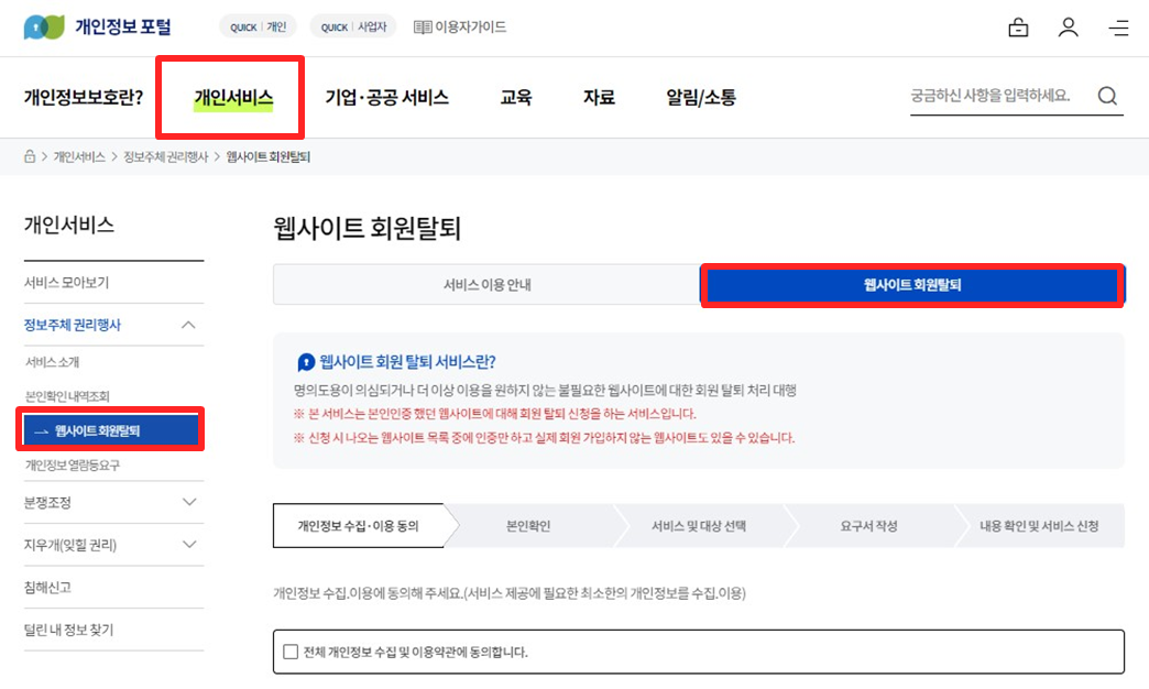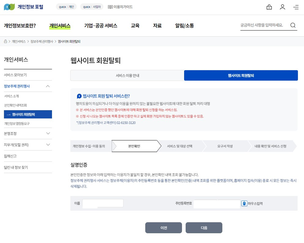 그러면 개인정보포털로 연결이 되고 거기서 개인서비스 ▷ 웹사이트 회원탈퇴를 클릭해줍니다.