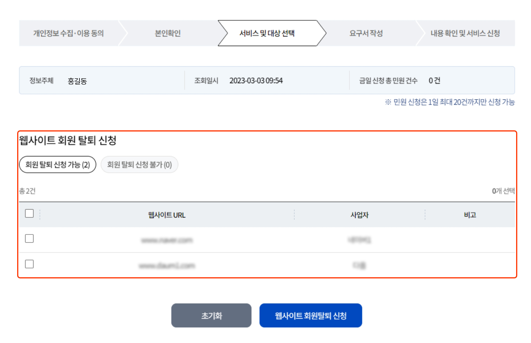 다음 서비스 및 대상 선택에서 웹사이트 회원탈퇴를 선택하여 신청해줍니다.