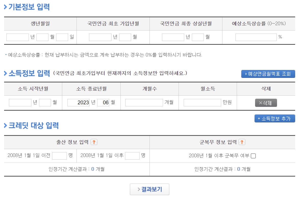 예상연금 모의계산을 누르면 기본정보, 소득정보, 크레딧 대상을 입력하여 간단하게 조회를 할 수 있습니다.