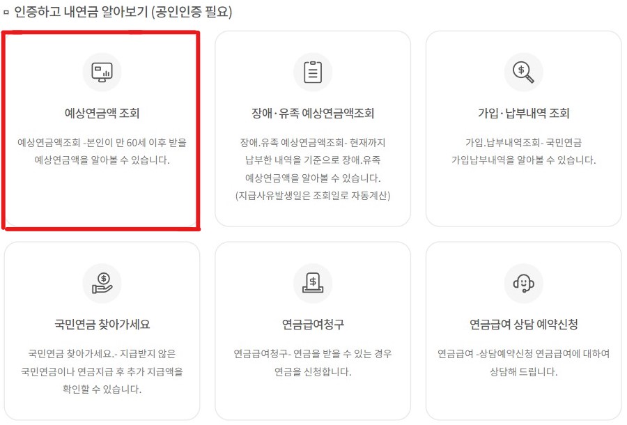 국민연금공단 홈페이지를 이용하면 국민연금 예상수령액을 간편하게 조회가 가능하며 인증없이 간단하게 알아보는 방법과 공인인증 후 알아보는 방법이 있습니다.