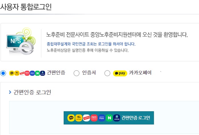 국민연금 예상연금액 알아보기를 누르며 아래와 같이 공인인증 화면이 뜹니다. 요즘은 카카오나 네이버 등을 통해 간편인증이 가능하니 간편인증을 시행해줍니다.