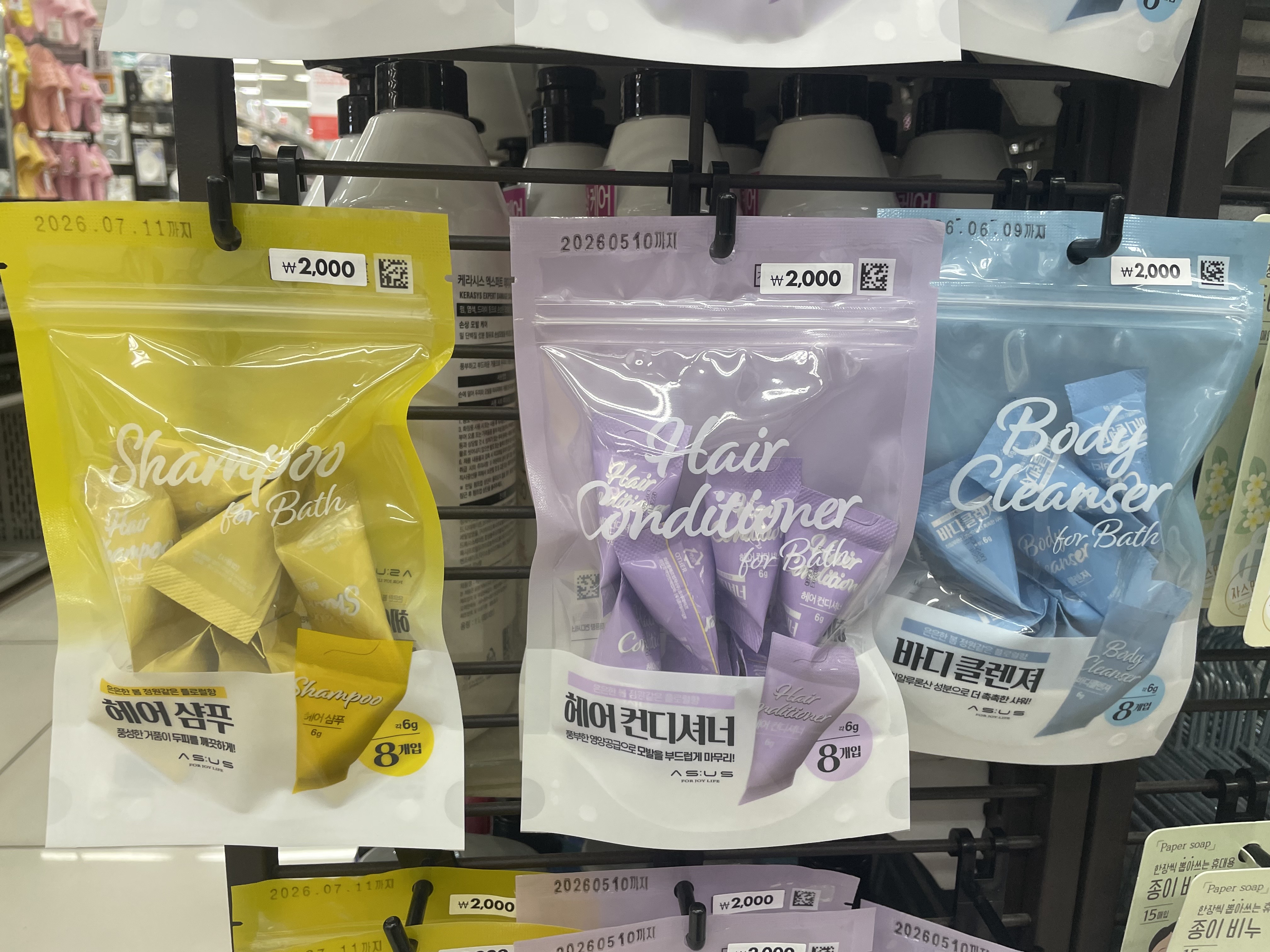 여행할 때 여러 용기나 통째로 샤워/세안용품을 들고 가기엔 너무 짐이 될 때, 일회용으로 된 제품을 쓰고 바로 버리고 오면 짐을 줄일 수 있고 간편합니다.
