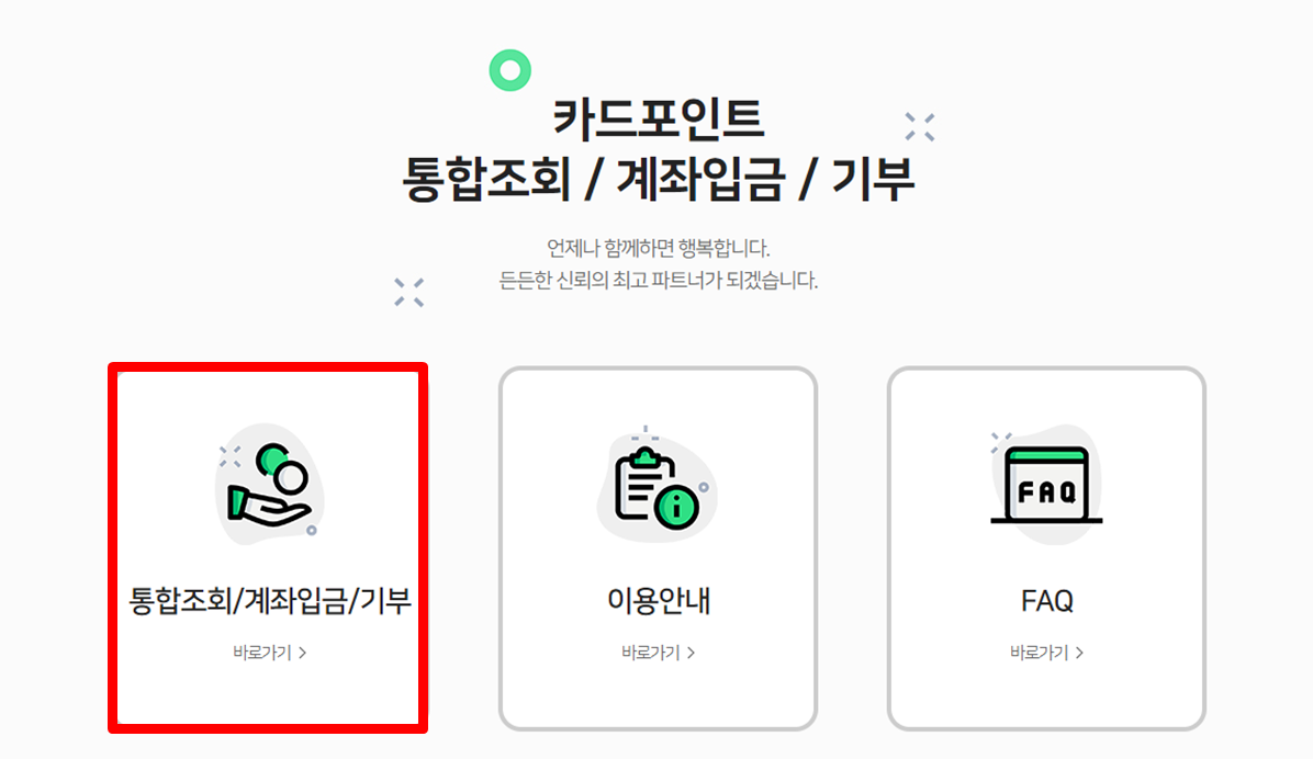 "카드포인트 통합조회 시스템" 에 접속을 한 후 통합조회/계좌입금/기부를 선택해줍니다.