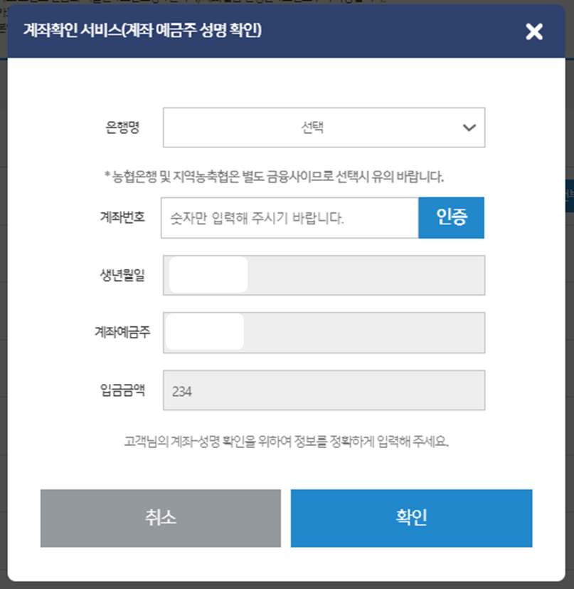 입금을 받은 은행명과 계좌번호를 입력하고 확인을 눌러줍니다.