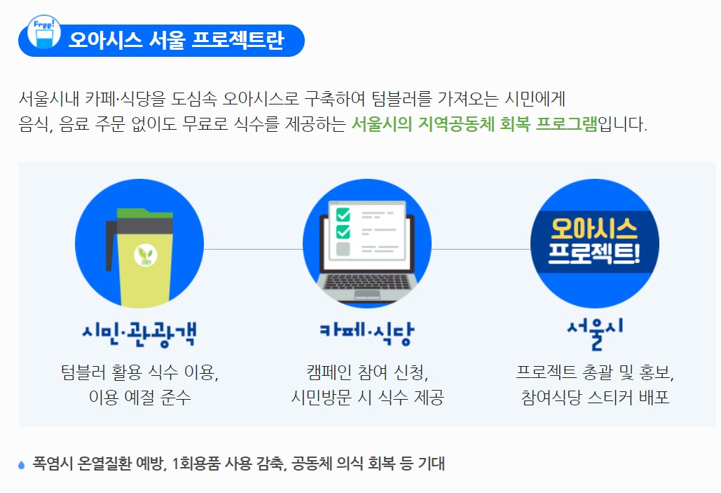 플라스틱 사용을 줄이고자 하는 '오아시스 서울 캠페인'으로 서울 내 스타벅스 등 일부 점포에서는 텀블러를 가져가면 무료로 식수를 제공해줍니다.