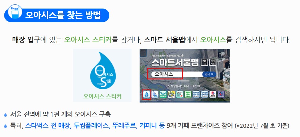 오아시스 서울 참여 매장 및 기관은 ‘오아시스 서울’ 누리집에서 매장찾기를 하거나 오아시스 스티커가 부착된 매장에 텀블러를 지참하고 방문하면 됩니다.