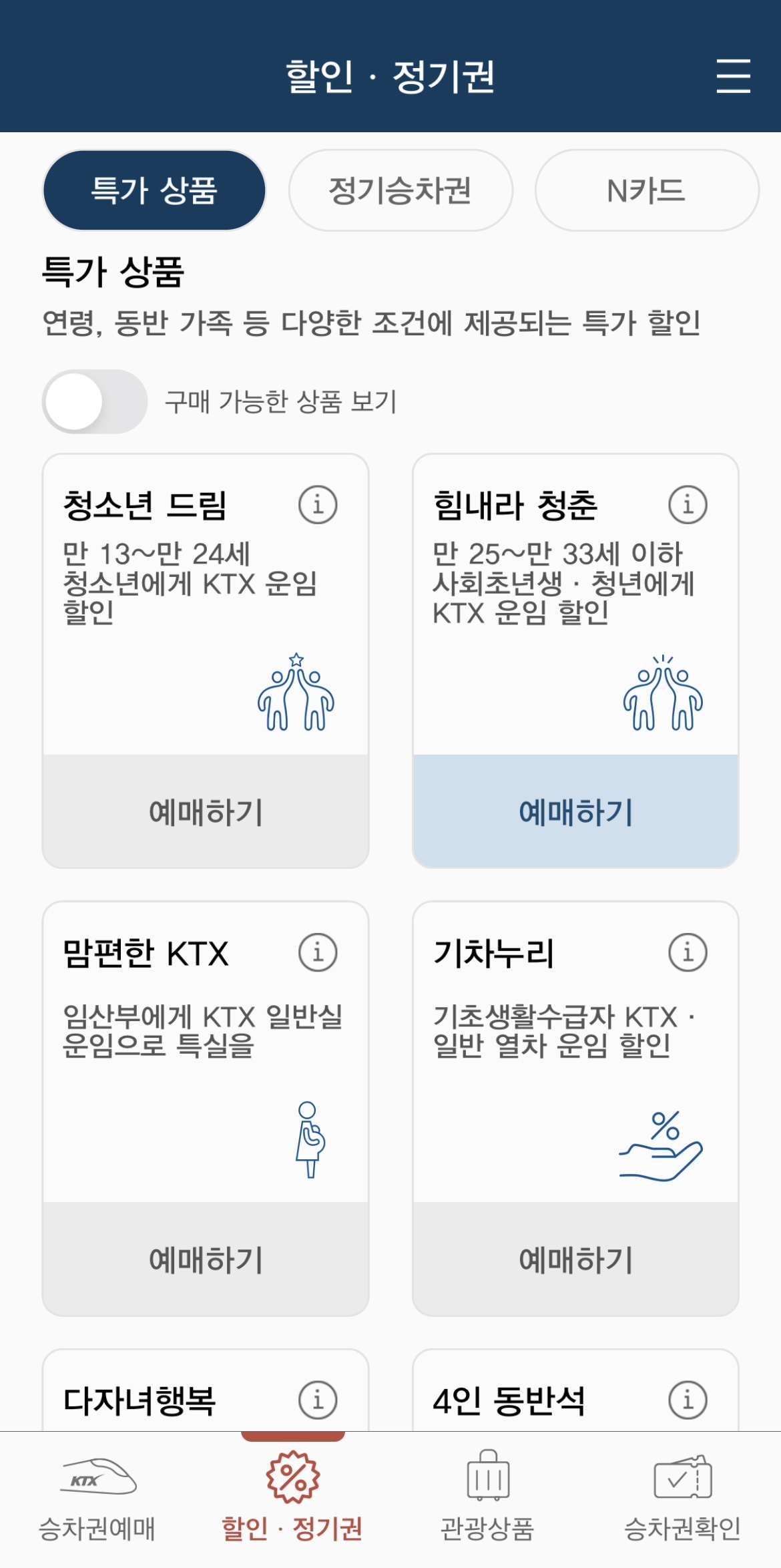 코레일앱에 들어가서 로그인을 한 후 ▷ 할인·정기권에 들어갑니다.