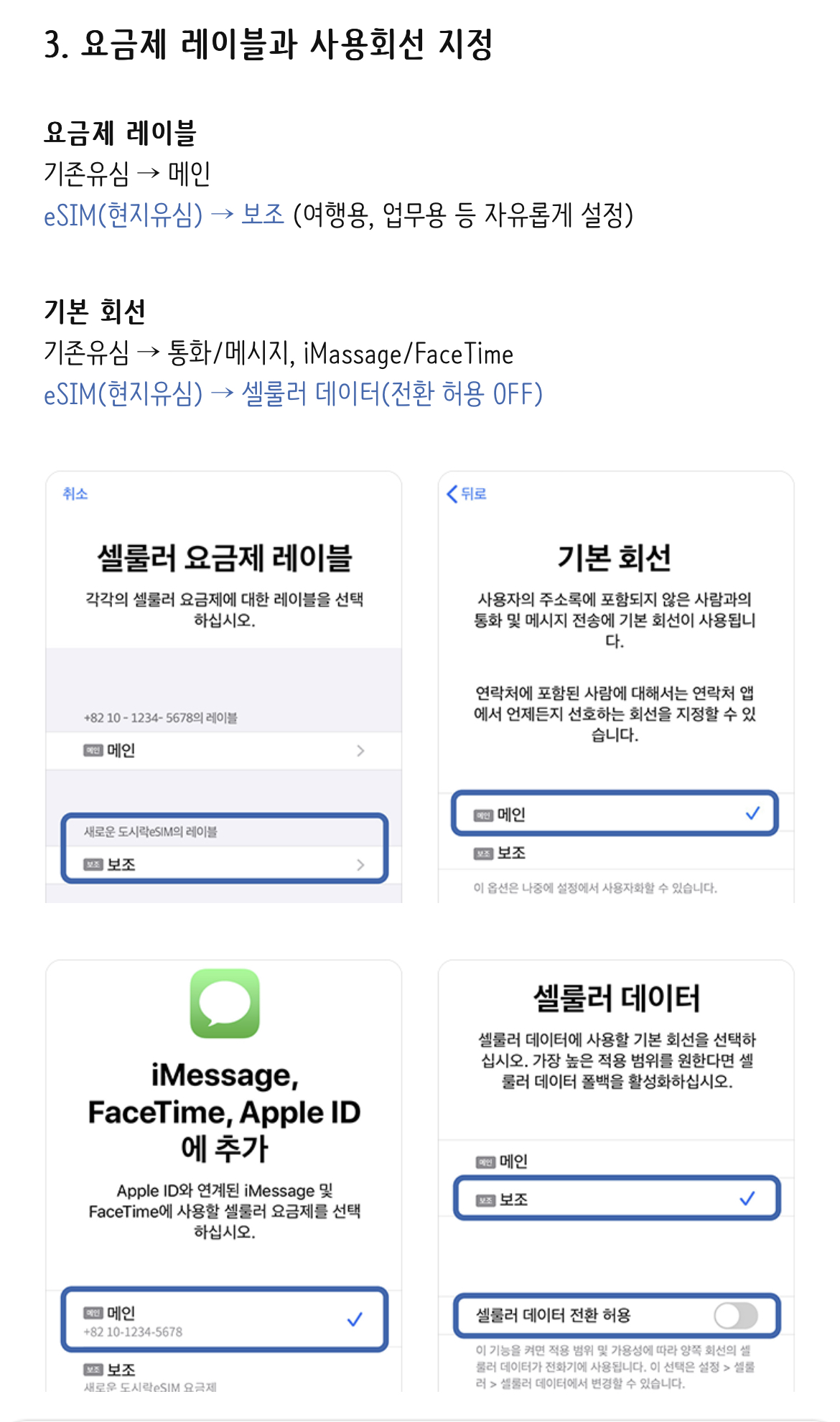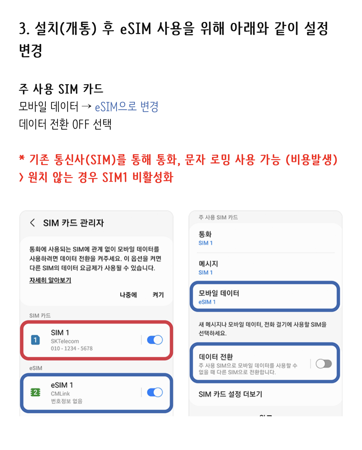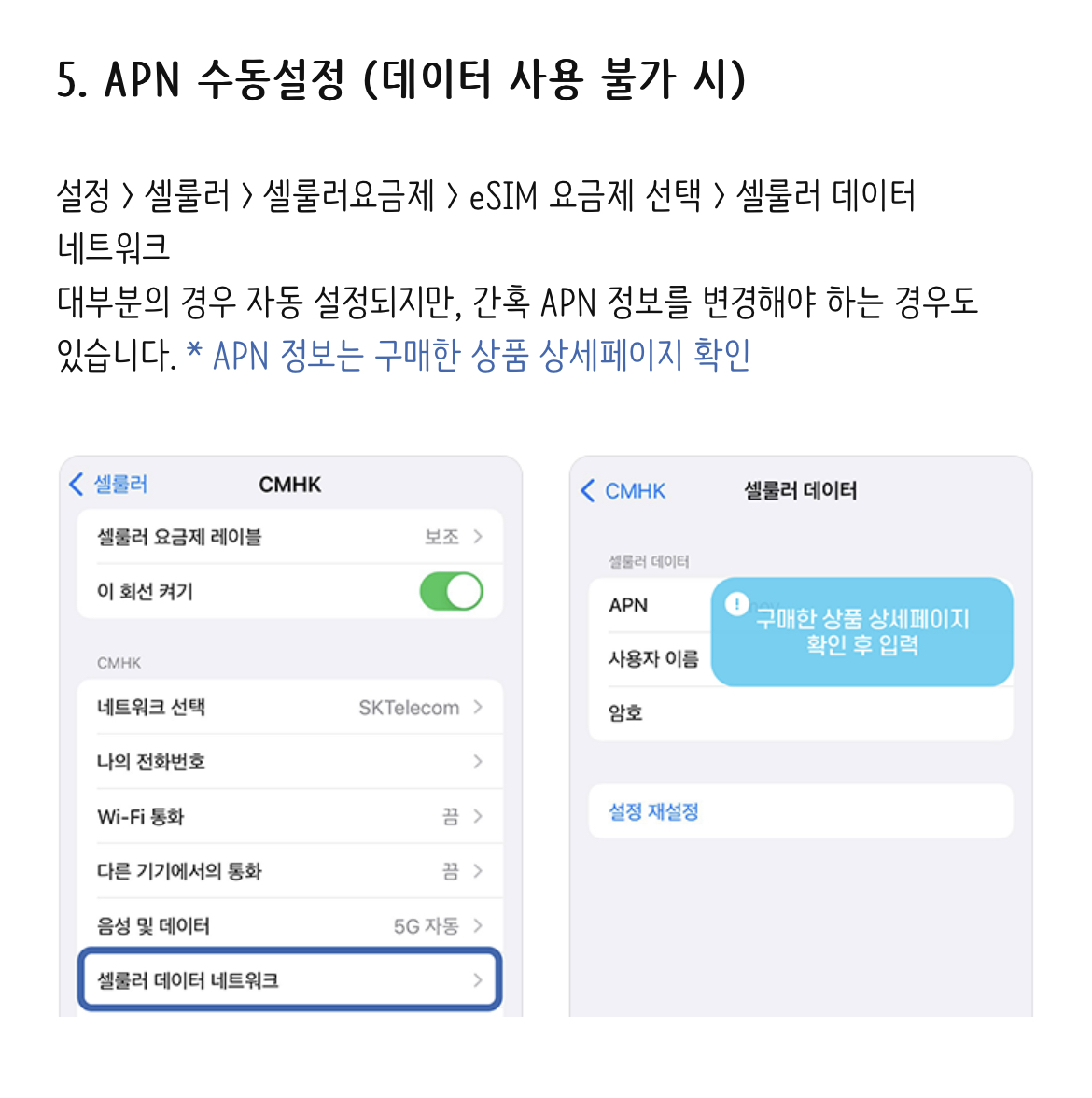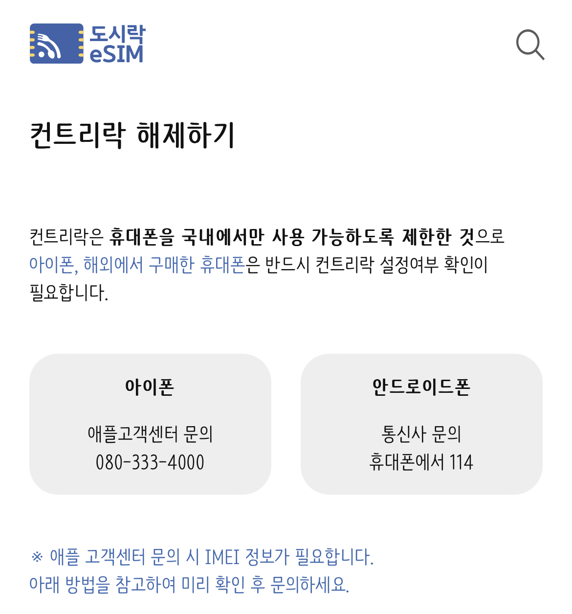 eSIM을 설치한 후 해외에서 사용하기 위해서는 국내에서만 사용 가능하도록 제한한 컨트리락을 해제해주어야 합니다.