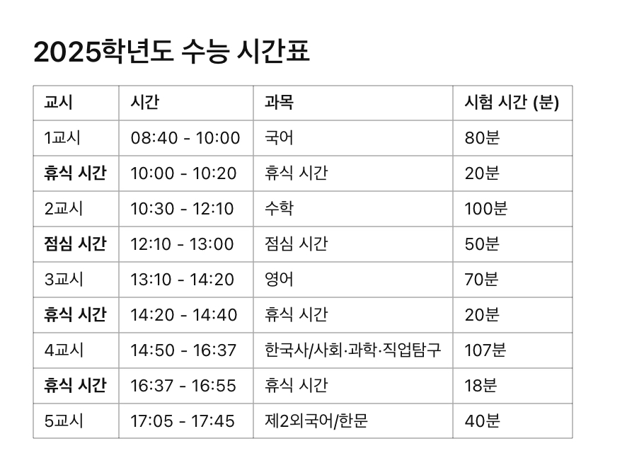 5교시 - 제2외국어/한문 (17:05 - 17:45, 40분): 수능의 마지막 과목입니다. 끝까지 긴장을 늦추지 말고 집중력을 유지하세요
